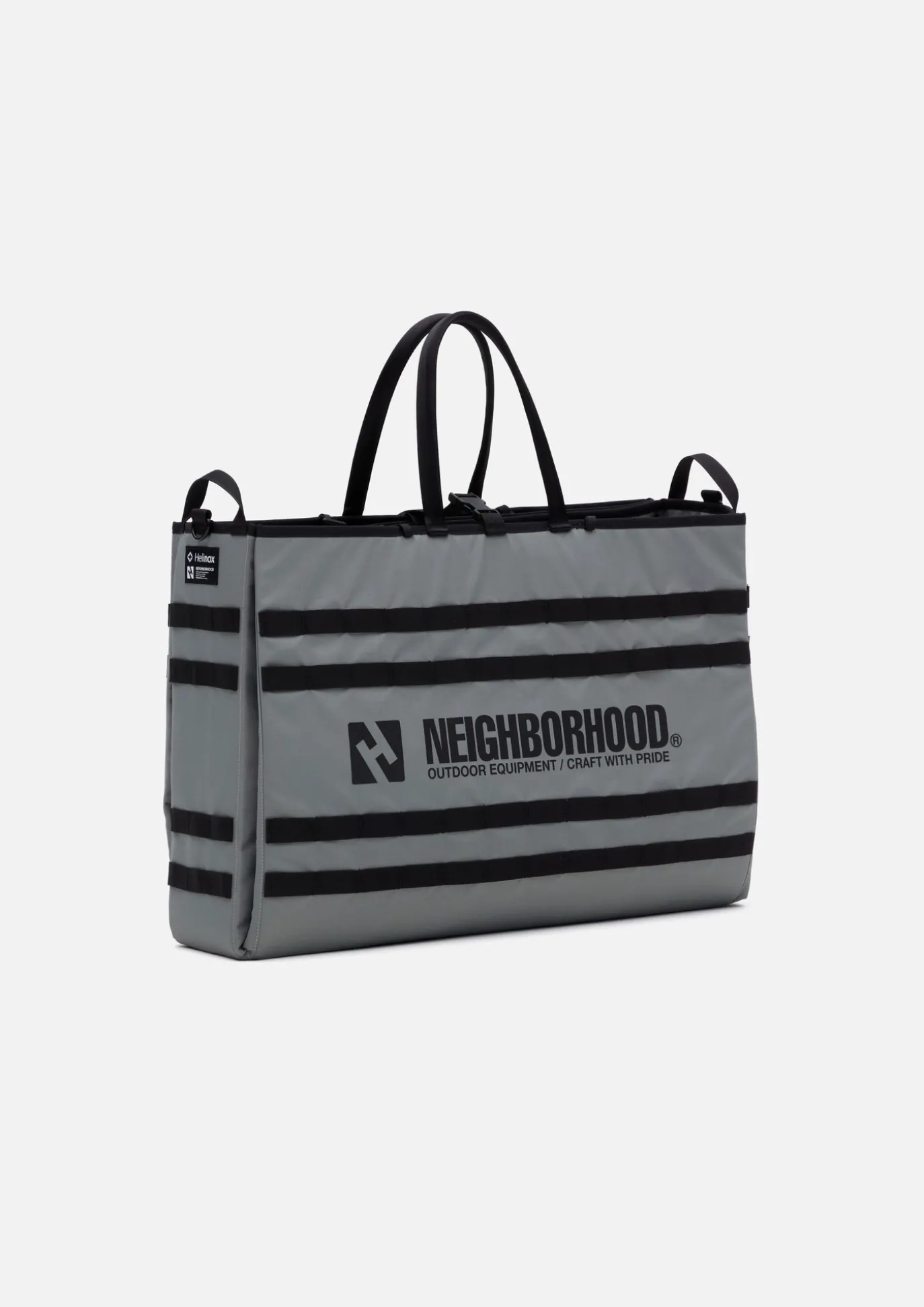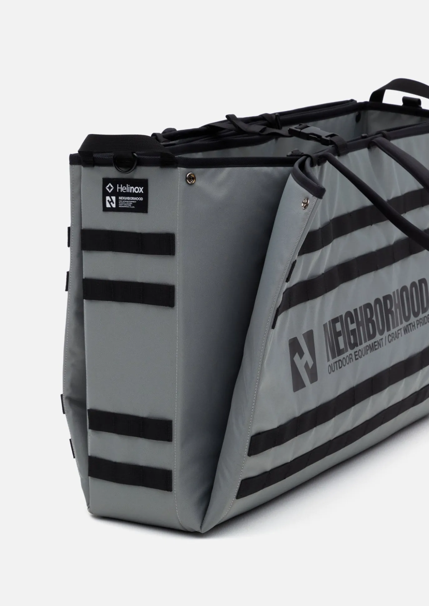 Folding Tote With Unique Size And Designed With Helinox. Option To Hold Two Swivel Chairs And One Solid Top Table. Dyed In Original Gray Color With Brand Logo Printed On Both Sides. When Fixed Part Is Removed, Tote Can Be Unfolded Into Sheet And Used As Picnic Mat. Collaboration Model With Helinox.