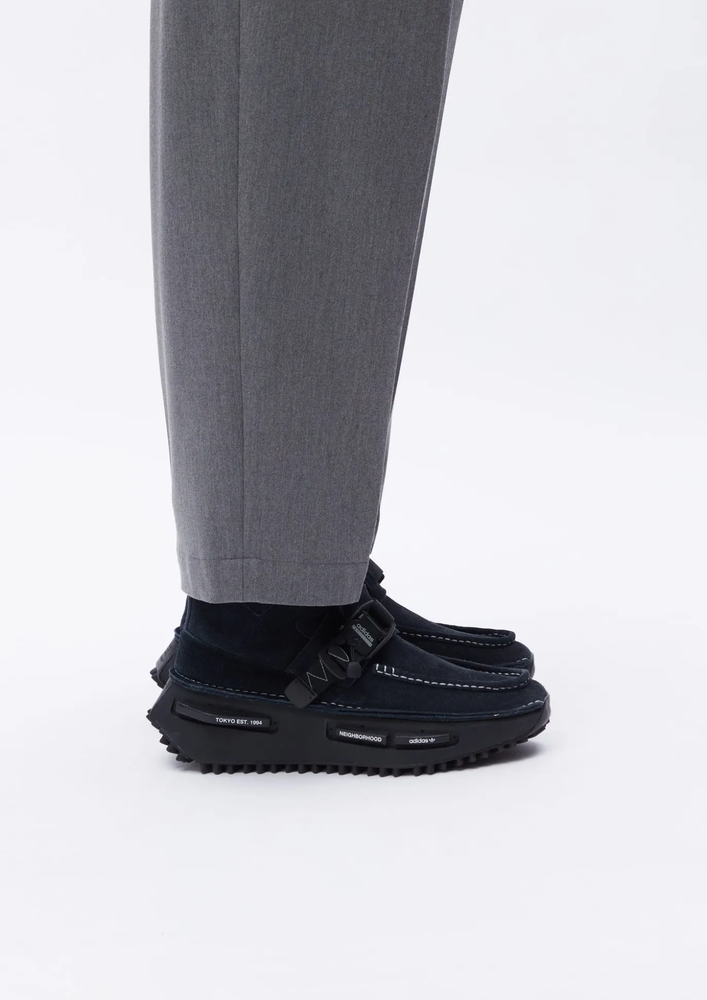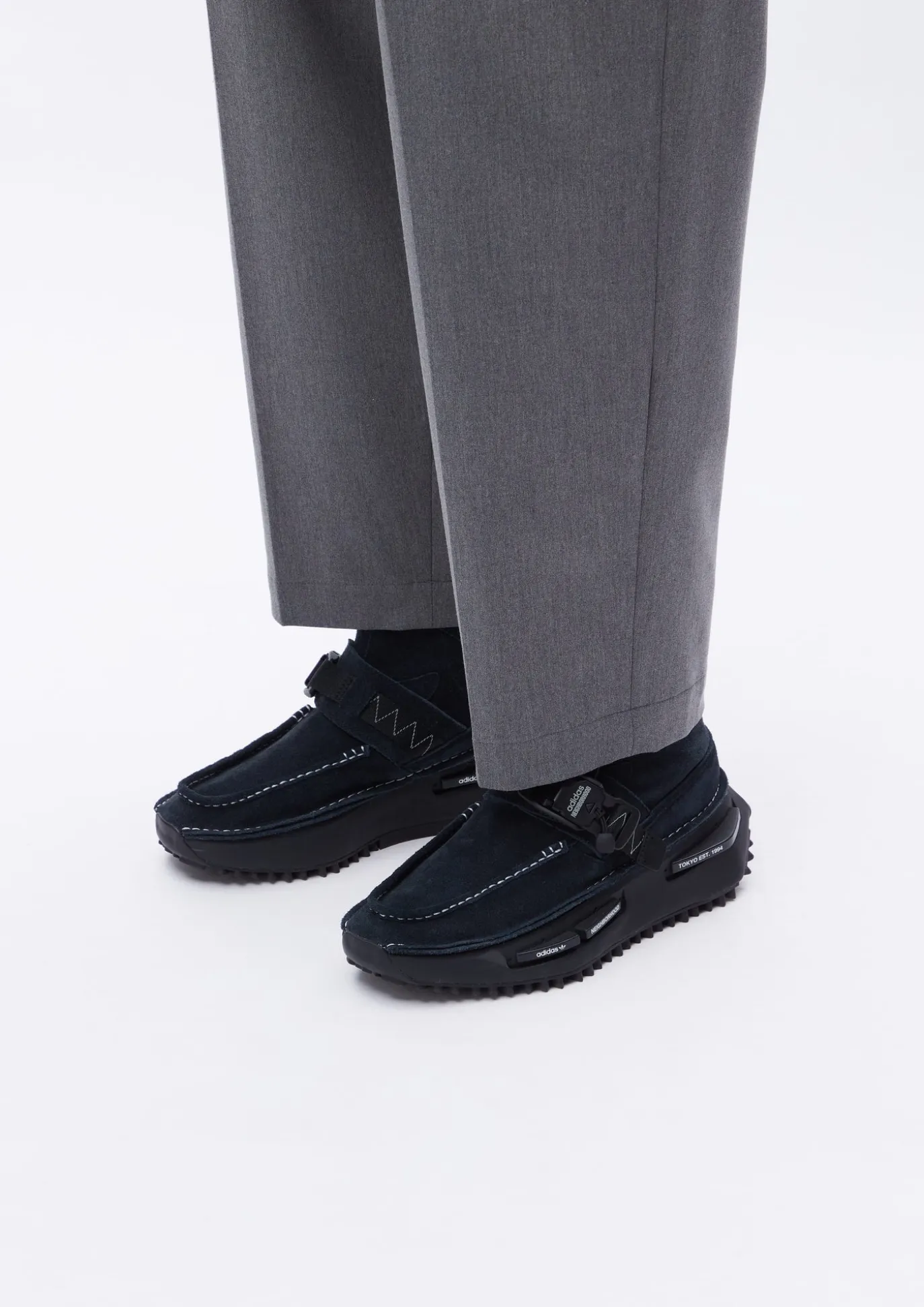 Based On Nmd S1 Created In 2021, Collaboration With Adidas, Using Suede Leather For The Upper And Inspired By Riding Boot. Half-Zip Design For Convenience. 3D Trefoil Logo On Sole. Special Edition With Zigzag Stitched Nylon Tape And Magnetic Buckle Constructed By Fidlock Of German Origin With Brand Logo Print.