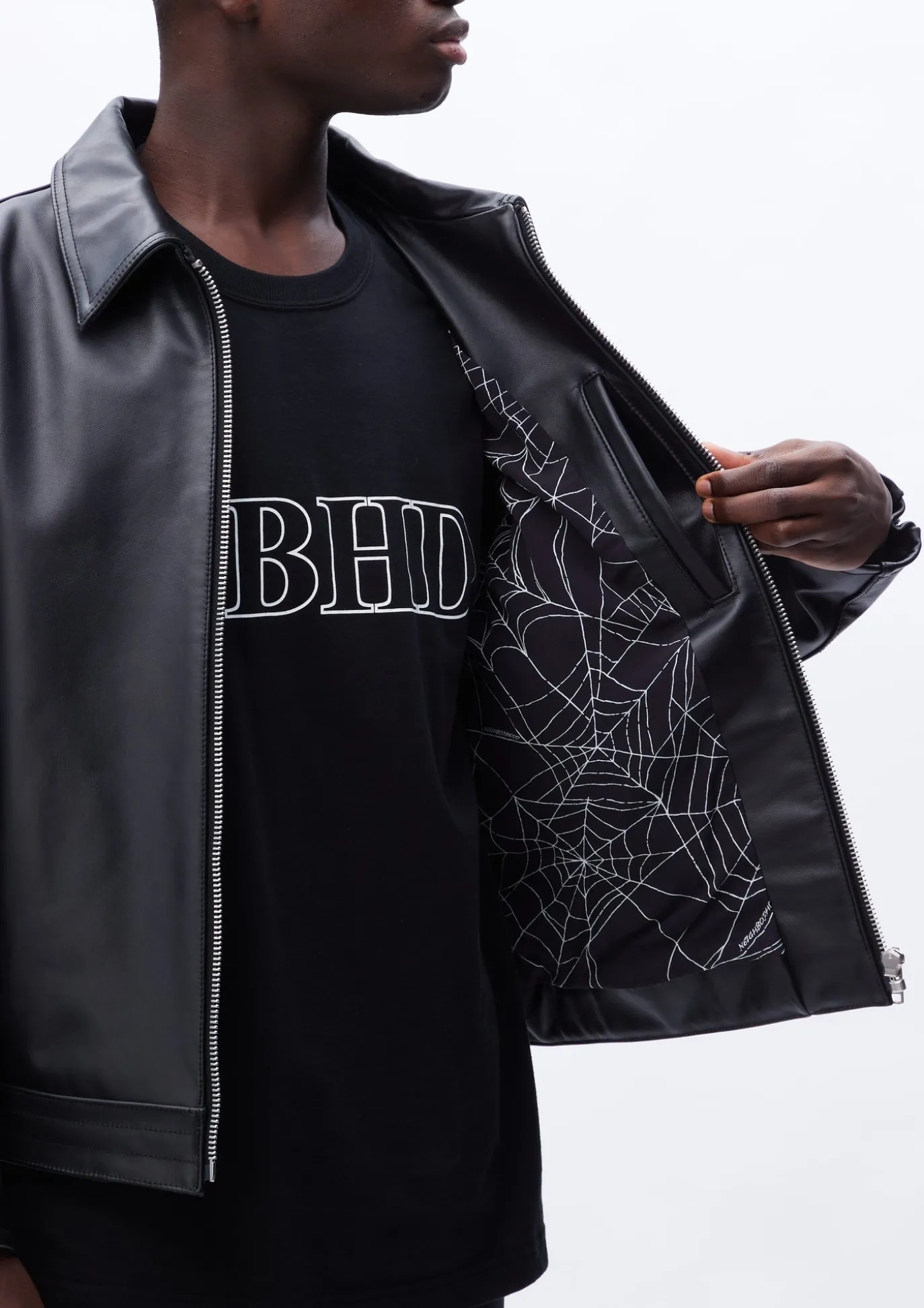 Cowhide Leather Sports Jacket With Stain-Resistant Nappalan Finish. Double-Brimmed Pockets On Both Sides And An Adjuster Belt Attached To Waist. Lined With Original Spiderweb Pattern. Patch On Left Chest.